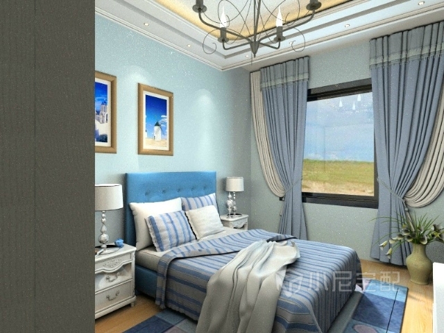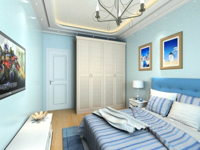 次臥,純白的歐式臥室家具搭配淺藍壁紙,色彩明快。