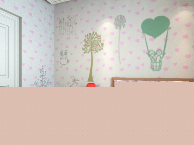 粉色心形墻紙給人一種清新可愛的效果,墻上的印畫將兒童房的浪漫氣氛烘托的淋漓盡致。