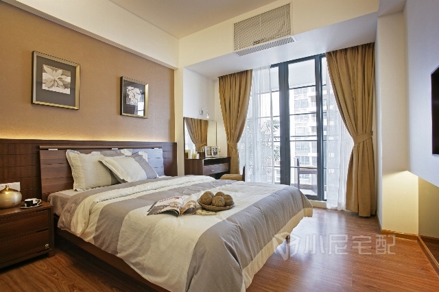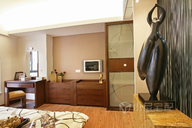 臥室沒有表現(xiàn)出明亮的色澤,而是用低飽和度的色彩裝飾,更顯出臥室的素雅,也給人一種舒適感。