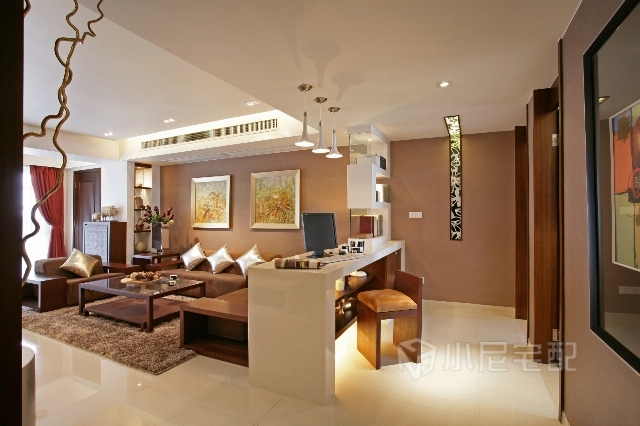 白色和米色的環(huán)境中,加了一些棕色來一起營造出溫馨的客廳。