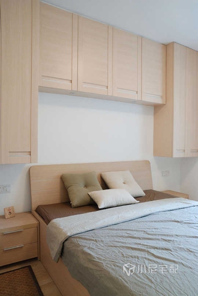 臥室不僅僅是休息的空間,同時可以在床頭增加一整排的吊柜,充分提高了儲物收納空間。