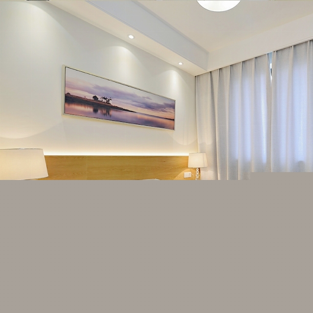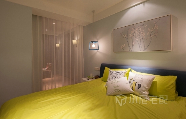 主臥的被套枕頭都是黃色的,很亮眼的顏色,墻體掛畫較為淺淡,和諧美好。