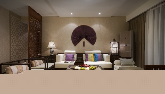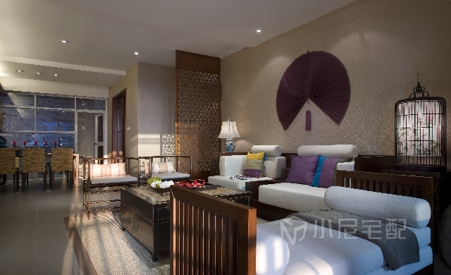 客廳的背景墻用扇形做的裝飾,十足的東南亞風(fēng)。