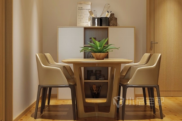 餐廳:簡單的弧形桌椅搭配白色餐邊柜,吃飯的時候也愜意。