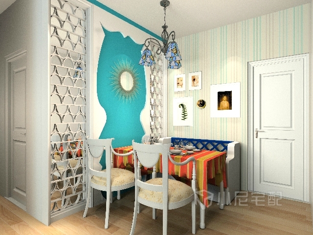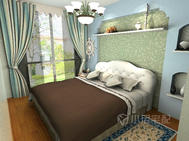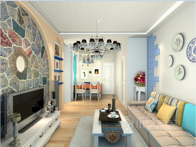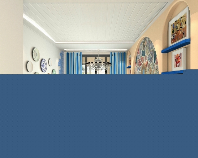 以海洋的蔚藍色為基色調的顏色搭配方案,自然光線的巧妙運用,富有流線及夢幻色彩的線條等軟裝特點來表述其浪漫情懷。