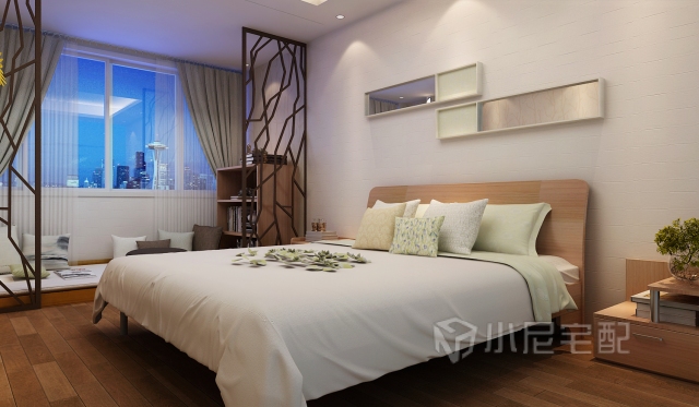 潔白帶有凹凸感的壁紙,使得單一的墻面富于變化,金絲胡桃色的床和床頭柜整體統(tǒng)一,大氣沉穩(wěn),返璞歸真。