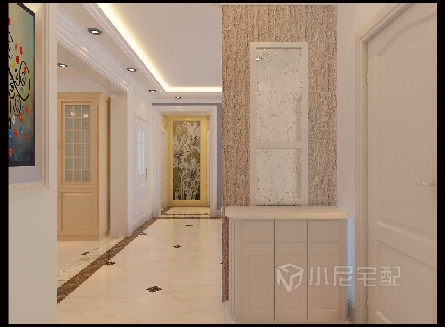 過道走廊明亮節(jié)儉,走廊盡頭以圖案馬賽克收尾,彰顯主人的審美感