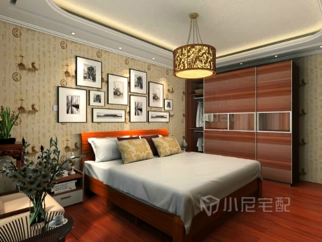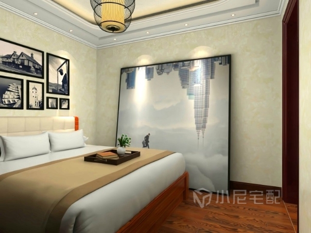 主臥室:整個主臥是非常的寬敞,在進(jìn)門擱置一組推拉衣柜后,緊挨著床頭柜及2米的大床,靠近窗戶的地方放置兩組簡單的沙發(fā)及小茶幾,作為躺臥疲累之際所用,整個墻面的壁紙選用極具文化特色的樓蘭經(jīng)為飾,暖色為底,營造舒適的書香之家,再搭配以窗格式吊頂和簡單的綠色植物搭配,烘托自然和諧,文明的絕佳居所。