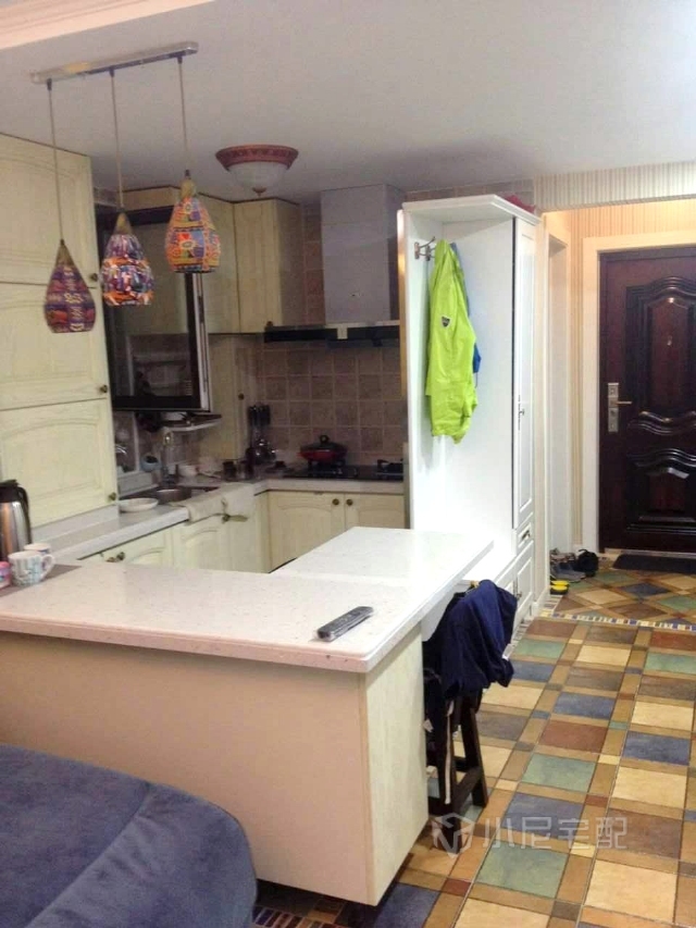 入戶位置,地面菱形鋪貼,配合彩色波打線,頂部石膏線和地中海風(fēng)情吸頂燈。