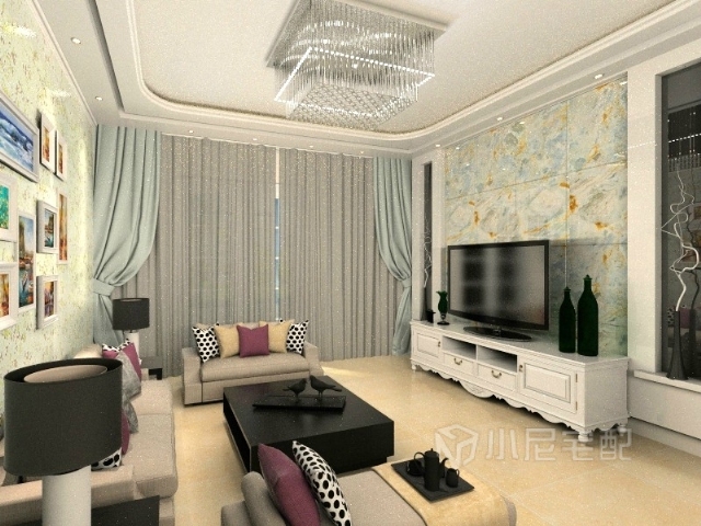 暖色基調(diào),電視墻主要是彩粒漆。頂部簡(jiǎn)單造型。