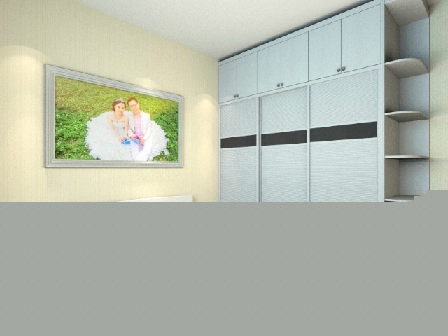 主臥簡(jiǎn)單的一張床,一個(gè)衣柜,床頭為婚紗照掛墻裝飾,進(jìn)屋主人心情舒爽。
