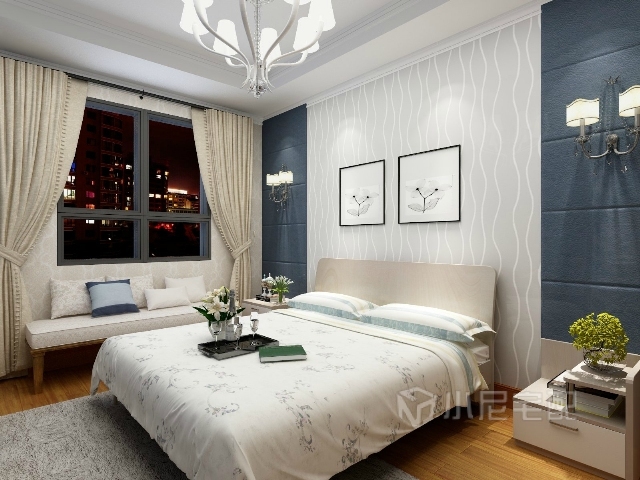 淡藍(lán)色的背景墻,顯得恬靜安逸,乳白色的窗簾,窗前的沙發(fā)凳,使整個(gè)臥室更加舒適柔美。