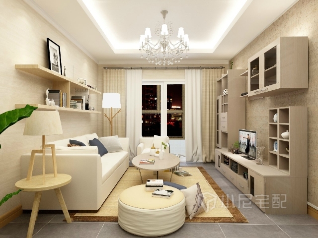 深灰色的地磚搭配暖黃色的地毯,顯得十分溫馨。定制的電視柜組合增加了儲(chǔ)物功能。