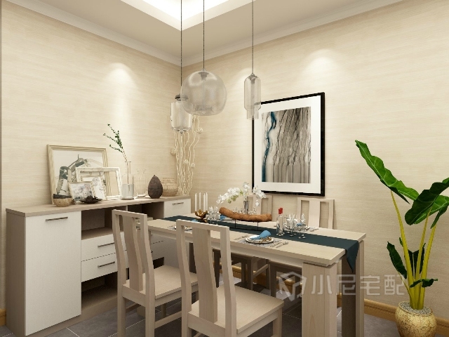卡米楓木加白橡套色的餐邊柜,綠植,吊燈,整體展現(xiàn)出現(xiàn)代,時(shí)尚的設(shè)計(jì)理念。