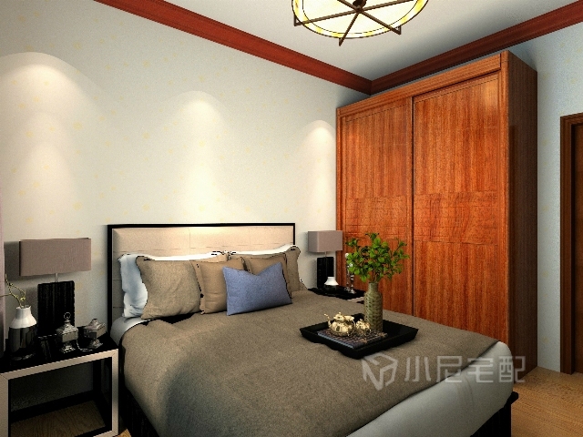 主臥實(shí)木頂角線(xiàn),實(shí)木衣柜配實(shí)木床,可以看出臥房主人的儒雅
