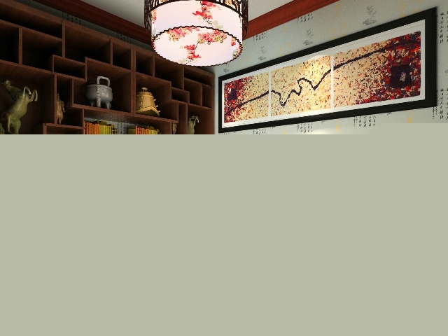 書(shū)房旁邊一個(gè)老榆木書(shū)柜,后面是簡(jiǎn)單裝飾畫(huà),墻面中式壁紙。帶著中式的清靜感