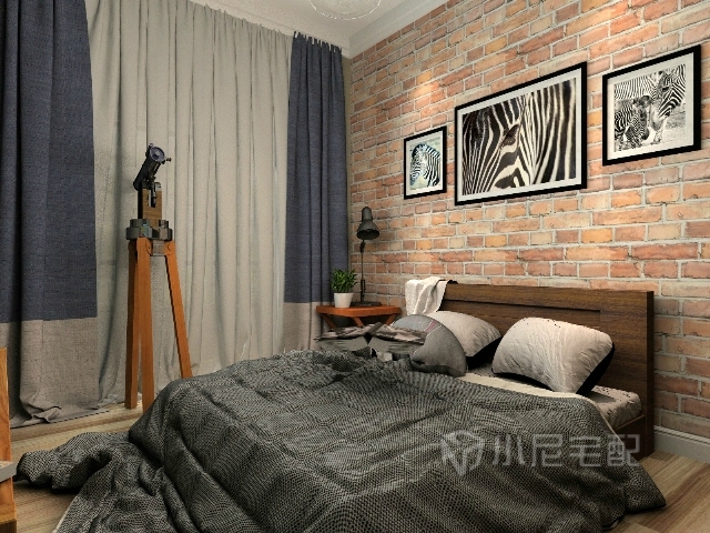 工業(yè)風(fēng)的家俱常有原木的蹤跡。主臥室正是采用了這一點(diǎn),粗狂的墻面與周圍的家具正好體現(xiàn)這一點(diǎn)