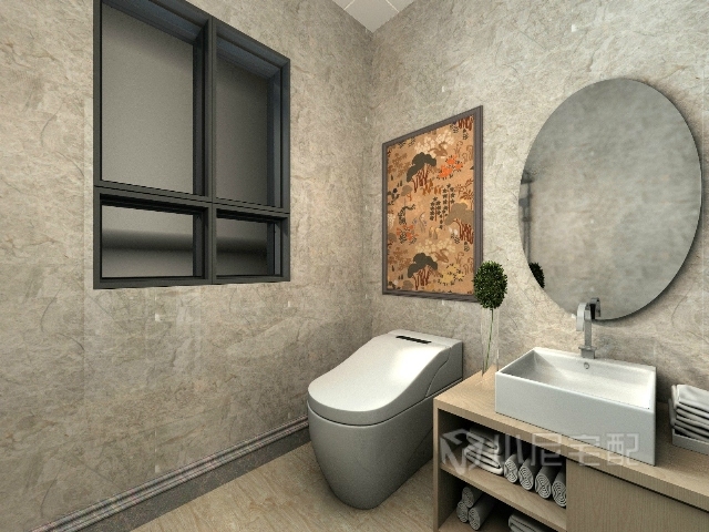 煙灰色的墻面處理,簡潔的布局使衛(wèi)生間整潔大方