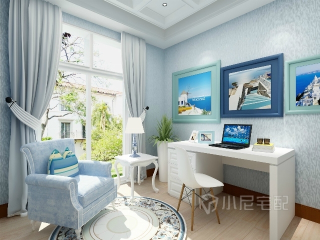 白色的書桌椅,藍(lán)色的沙發(fā),大幅的希臘風(fēng)景裝飾畫,既浪漫又有學(xué)習(xí)工作的靜謐的氛圍。