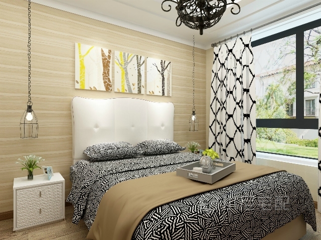 舒適的軟床,黑白花紋的窗簾,木紋壁紙裝飾的背景墻,現(xiàn)代感十足又不失溫馨。