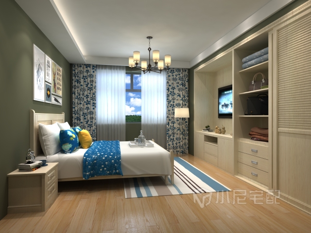 定制柜體包含了衣柜和電視柜,整面墻的設(shè)計(jì)顯得空間更加統(tǒng)一