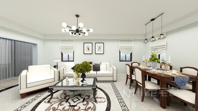 客廳地面中心采用水刀拼花,簡(jiǎn)單中不失特色,客廳餐廳區(qū)域采用不同吊燈區(qū)分,整體簡(jiǎn)潔,滿(mǎn)足使用功能。