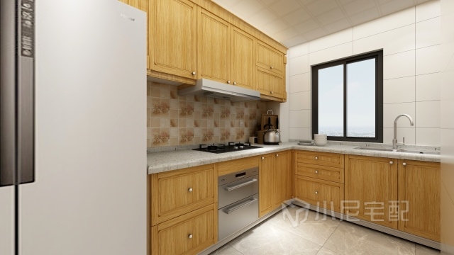 廚房電器較多,冰箱、烤箱在西側(cè),灶臺(tái)旁抽屜放置調(diào)料,水盆旁抽屜分別放置餐具。
