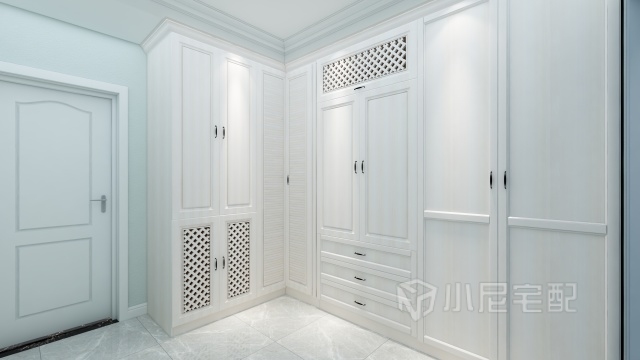 衣帽間采用網(wǎng)格門(mén)、百葉門(mén)打破傳統(tǒng)的門(mén)板,網(wǎng)格門(mén)內(nèi)放置鞋襪,更加透氣,長(zhǎng)衣、短衣的各有歸處。