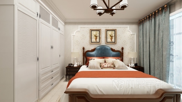 主臥按業(yè)主需求,衣柜采用不同門(mén)板造型,床頭背景墻采用弧形造型增加溫馨氣氛。