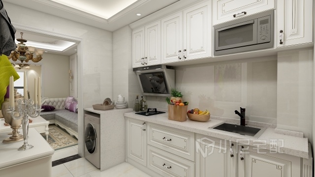 廚房采用防水石膏板,櫥柜為白色鑲金邊柜門簡單漂亮