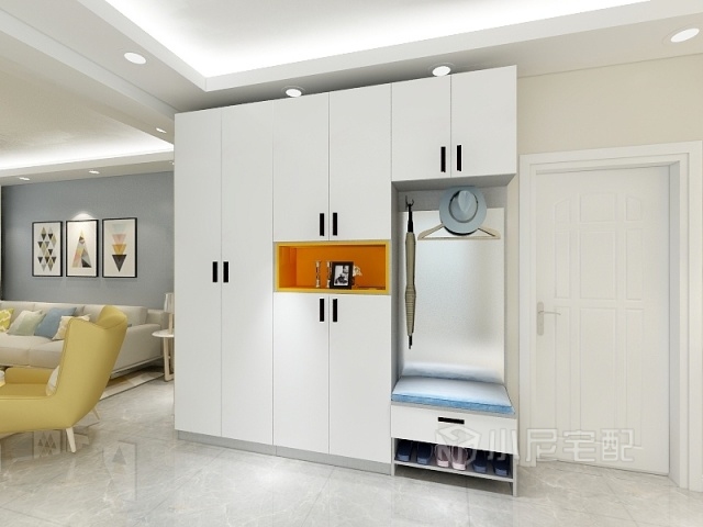 門廳鞋柜業(yè)主想要一個儲物功能多一些的,整體灰白搭配,其中檸檬黃的開放格是整體的點(diǎn)睛之筆,讓整個空間顯得青春洋溢。