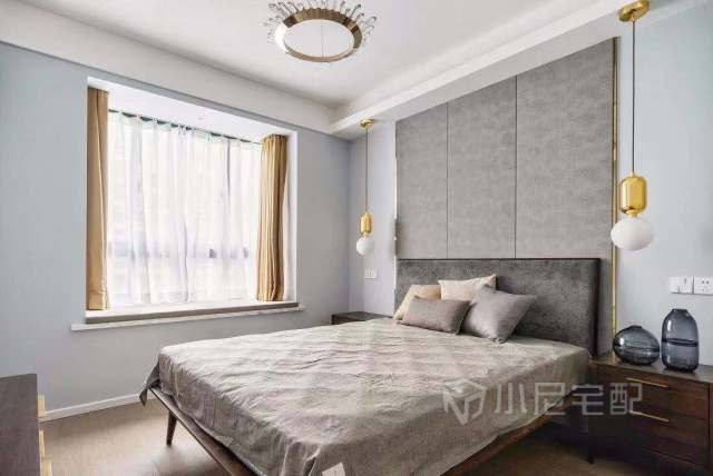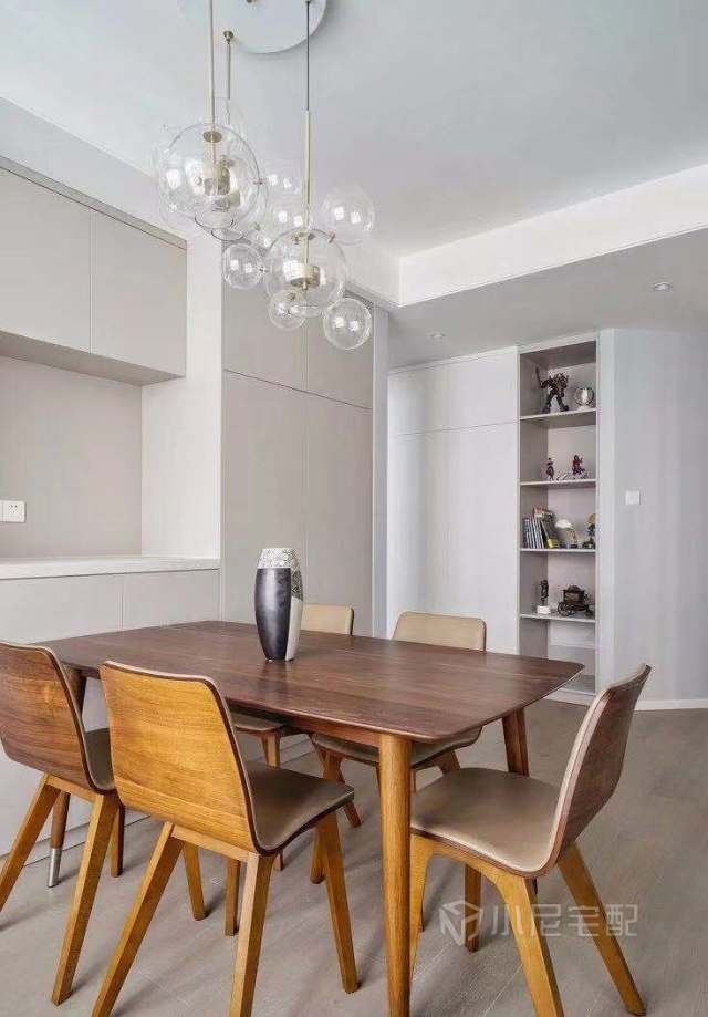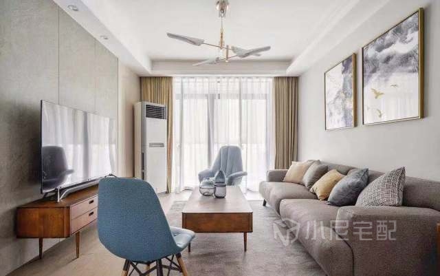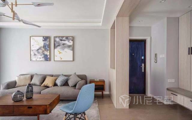 整個(gè)空間在色系上選擇灰藍(lán)色與白色作為背景色,棕與會(huì)為主體,藍(lán)黃作為輔助,適當(dāng)?shù)慕鹕约狱c(diǎn)綴,定格為簡約北歐風(fēng)
