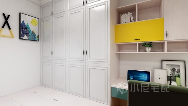 次臥室空間較小,書桌利用藍黃撞色配合白色衣柜門,生動活潑