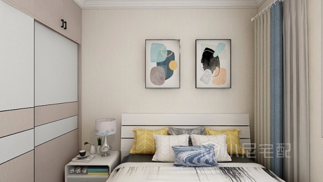次臥室因空間較小,所以采用推拉衣柜,配合平板床頭,顯得緊湊自然