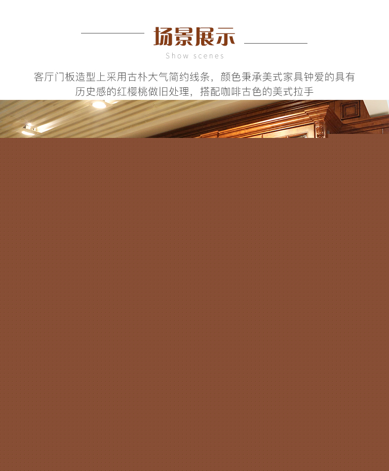 | 細節(jié)描述 | 客廳門板造型上采用古樸大氣簡約線條,顏色秉承美式家具鐘愛的具有歷史感的紅櫻桃做舊處理,搭配咖啡古色的美式拉手。注重黃金比例設計,巧妙的柜體結構形成對稱,強調(diào)家具帶給人的平和感,并且把現(xiàn)代的功能納入其中,裝飾效果好,穩(wěn)定性強,儲物更加方便。 |