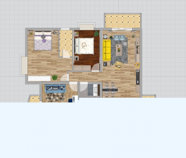 白色木飾面板,檸檬黃的布藝沙發(fā),灰色的地毯,開闊明亮的客廳,簡潔又舒適。
