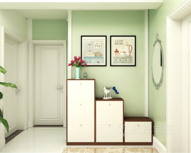 玄關(guān)一套組合鞋柜,一面歐式的鏡子,簡約的裝飾畫,讓人一進門,自然清涼的感覺迎面而來。
