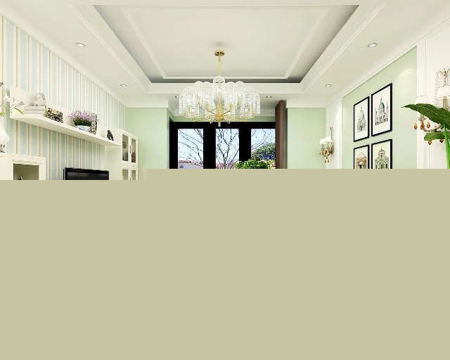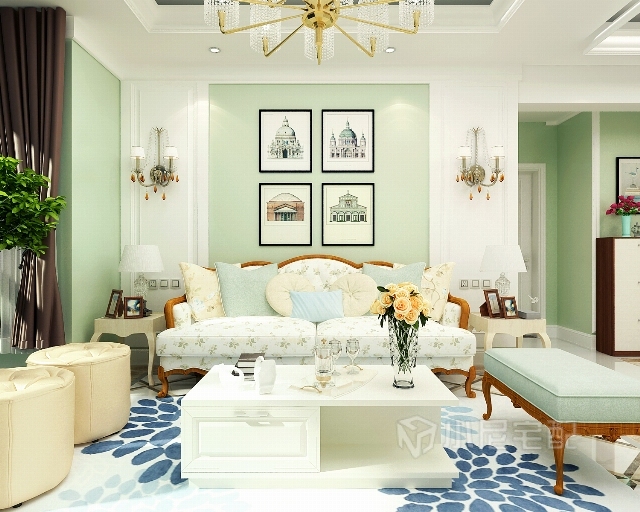 淡綠色的壁紙,既環(huán)保又養(yǎng)眼。歐式碎花沙發(fā),白色的茶幾和木飾面板,清新簡潔自然。