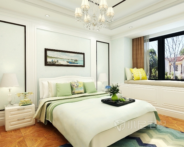 簡潔的背景墻,簡單的裝飾畫,臥室空間寬敞舒適。