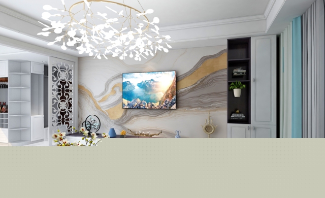 5米的大客廳背景墻為大理石雕刻花紋配輕奢款定制電視柜,外邊買不到的??顚S秒娨暪瘛?/pre>