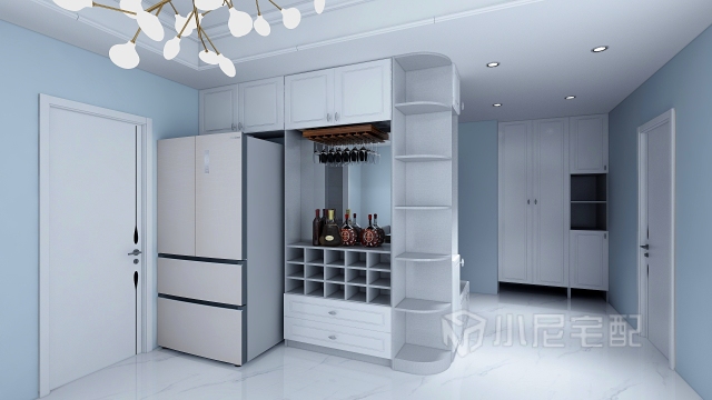 進門左側(cè)為夏季長裙,秋冬季長款衣物的衣柜,兩個無門柜可以隨手放包包一類的小件。右側(cè)為以換鞋凳為一體的玄關(guān)柜連接餐廳的酒柜